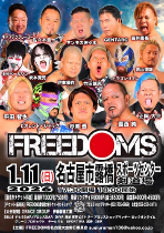 FREEDOMS ist eine im Sommer 2009 von Takashi Sasaki gegründete Indy-Liga, die als Nachfolger von Apache Pro gedacht ist. Im Gegensatz zu seinem Vorgänger konzentriert sich FREEDOMS bei seinen Shows weniger auf Hardcore Wrestling. Die großen Death Matches der FREEDOMS Wrestler finden bis auf einige Ausnahmen entweder bei Big Japan statt, oder bei von Jun Kasai produzierten Events. Wie schon Apache Pro arbeitet auch FREEDOMS eng mit Big Japan zusammen, sodass die Wrestler von FREEDOMS zum Stammpersonal der Liga aus Yokohama gehören. Zu den Gründungsmitgleidern von FREEDOMS gehören neben Sasaki noch Jun Kasai, GENTARO, The Winger und Kamui. Später gesellte sich auch Mammoth Sasaki zum Team dazu, nachdem er von einer langwierigen Nackenverletzung zurückkehrte. ![]()
